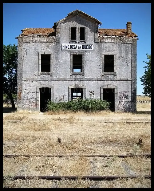 Hinojosa de Duero es un bello pueblo del Abadengo salmantino, tierra de Arribes cuya posesión antaño osciló entre Ciudad Rodrigo y Salamanca. Plaza fuerte de los dominios señoriales, marquesado y señorío, la historia de Hinojosa es la de esta tierra fronteriza entre reinos y obispados. De nada me sonaba a mí Hinojosa cuando la visité por primera vez, caminando perdido por tierras arribeñas. Venía yo de La Fregeneda en un día duro de verano casi tropical con temperaturas sofocantes y un sol que caía con entusiasmo. Poco antes de llegar al pueblo paré a un lado de la carretera y descubrí en mi mapa que Hinojosa contaba con estación del ferrocarril abandonada, de la línea que unía tierras portuguesas con La Fuente de San Esteban y Salamanca. Y allí me dirigí, a documentar la vieja estación alejada del núcleo urbano de Hinojosa. Y quizá por ello, por estar incrustada en un paisaje de dehesas, ve resaltada su inhóspita belleza.