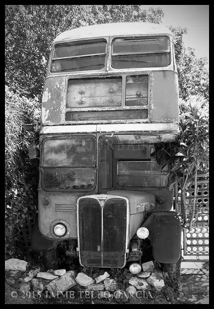 Un puñado de casas desordenadas forman el pequeño casco urbano de Arbujuelo y se apiñan en el valle fresco que por aquí forma el Pradejón, arroyo de corto recorrido que morirá en el cercano Jalón, al norte, allá por Medinaceli. La carretera que viene de Layna corre por el páramo en cota más alta y desde ella es difícil intuir la presencia del pueblo. Aunque para el que sepa dónde mirar será más fácil localizarlo ya que lo que sí se ve son los colmillos de conglomerado que lo protegen y son su seña de identidad. Los Tolmos dan sombra mañanera al pueblo de modestas casas de piedra y entre ellas aparece de pronto un autobús londinense de dos pisos. Y me pregunto cómo habrá llegado hasta allí, y marcho sin respuesta.