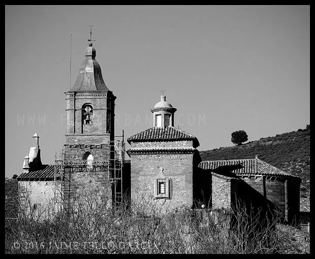Fue una experiencia extraña que me hizo sentir como si las calles y los edificios del pueblo estuvieran ahí a mi disposición, como un decorado inerte ofrecido a mi curiosidad. Lo cierto es que sentí algo de miedo, el mismo miedo que a veces me impide transitar por un bosque o un campo cerrado. Soledad, aislamiento y vulnerabilidad. Pero tampoco es un miedo paralizante, por lo que sigo con mi paseo. Cruzo el Manubles para lograr una panorámica excepcional de Berdejo y en el horizonte se recorta su castillo, cuya construcción se remonta al siglo XII, cuando se fortificó toda la línea. Merece la pena el esfuerzo de retroceder y acercarse hasta lo más alto, con precaución dado el estado precario del conjunto, y desde allí observar los buitres y el paisaje emocionante del recodo que forma el río y los campos de labor que han aprovechado la fértil llanura de inundación. A los pies de la fortaleza aparece el conjunto del Ayuntamiento, notable edificio renacentista muy bien restaurado, con cuerpos de ladrillo que descansan en sólidas columnas, y la Iglesia de San Millán, colgada sobre una roca y de trazas románicas, del siglo XIII, muy transformada en tiempo posterior. San Millán, que según cuentan nació en Torrelapaja, perteneciente entonces a la jurisdicción de Berdejo, por lo que los de aquí los reclaman como el berdejano más ilustre. Y por lo demás, un conjunto de casas bien arregladas para fines de semana y vacaciones, cuyo estado de conservación en absoluto remite al despoblamiento total del que antes hablaba. Una sorpresa.