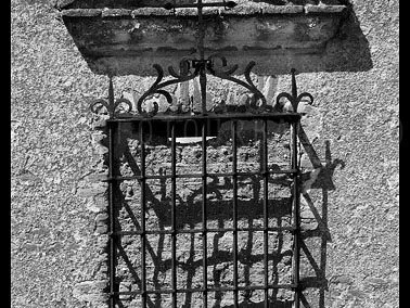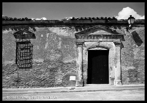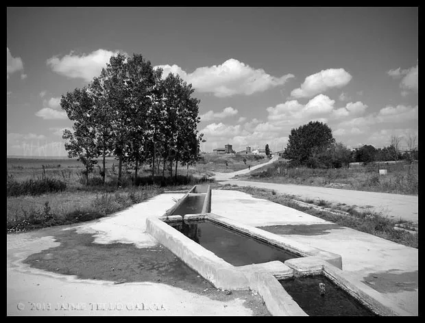 Tras la iglesia se levantan algunas viejas casas cuyas jambas y enrejados delatan su noble origen y ponen de manifiesto que por allí debió morar alguien que fue importante en la vida del pueblo. ¿Sería el famoso conde o alguno de sus descendientes? En mi paseo por el pueblo, que fue largo y minucioso, no me crucé con un alma, tal vez porque era la hora de la siesta veraniega y allí no se movía ni una rama. Tan sólo un ciclista que se dejaba caer por la cuesta del puente que salva la autovía y que, tras dejar atrás el pintoresco abrevadero, se adentró en el pueblo. Me entusiasman estas visitas en soledad, escuchar tan sólo el rumor lejano de coches pasando por la nueva autovía y el ladrido de algún perro reclamando atención.