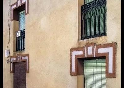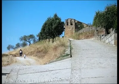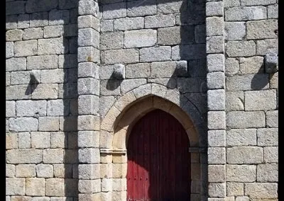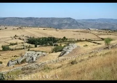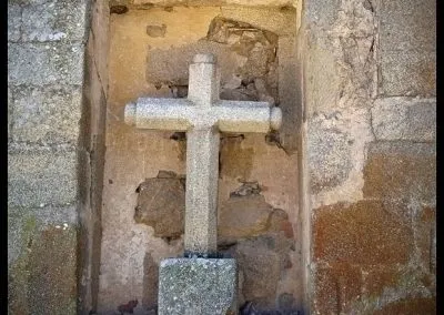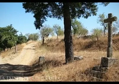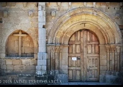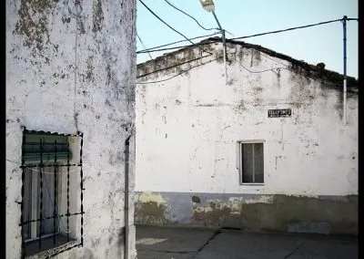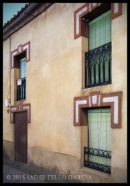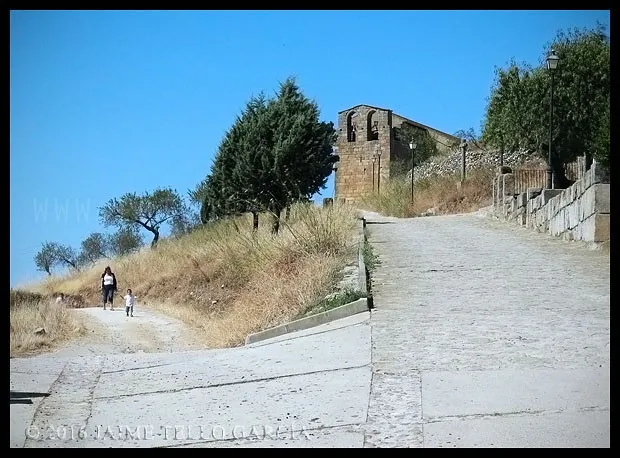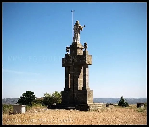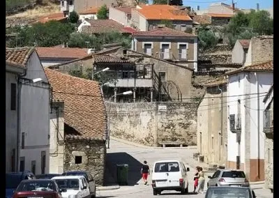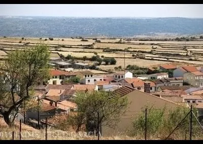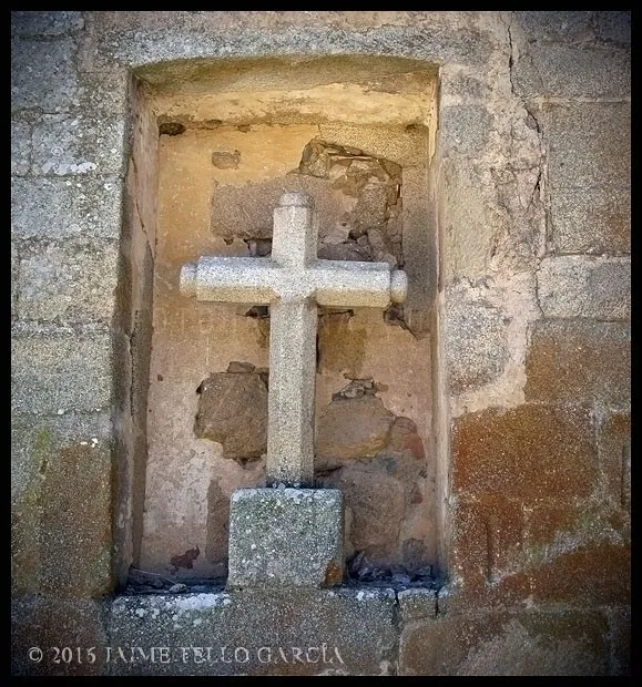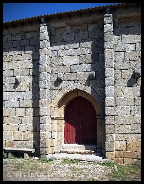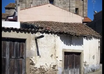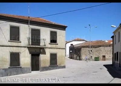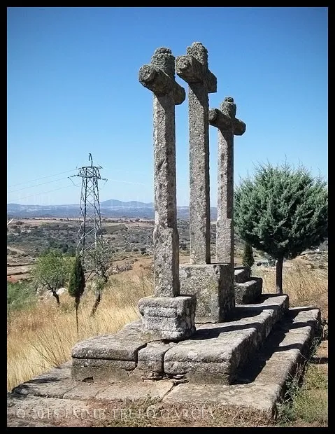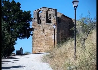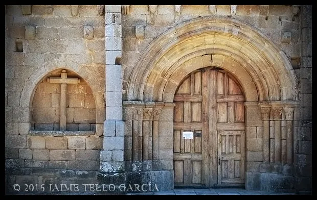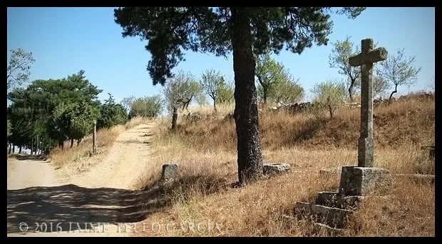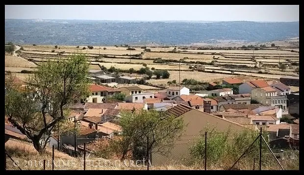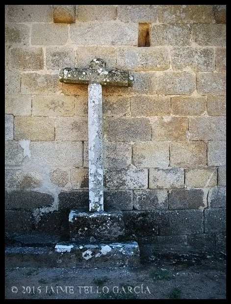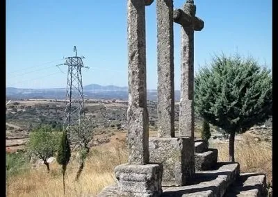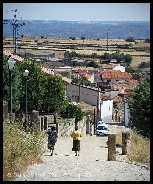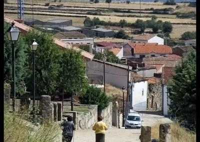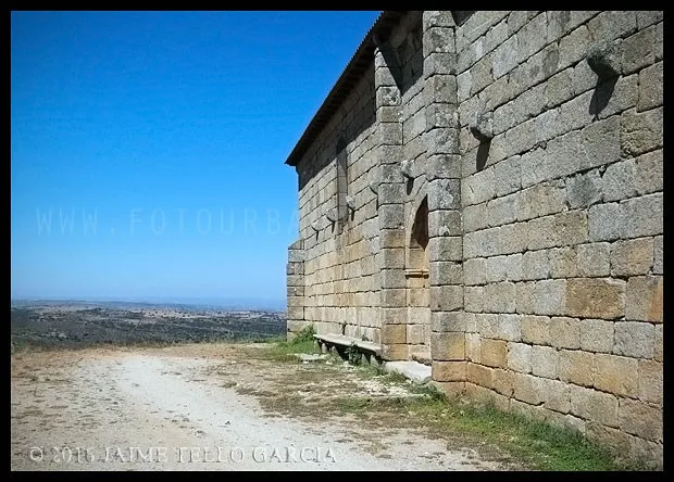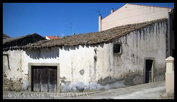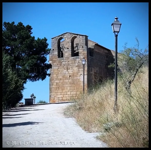 Llegado al pueblo, descubro un conjunto urbano uniforme, arquitectura popular de las Arribes, casas sencillas de dos alturas, adosadas, con patios y corrales por lo general no muy amplios. El papel en origen defensivo de muchos de los pueblos enclavados en esta tierra de frontera, así como la estructura de la explotación agraria latifundista, favoreció la configuración de cascos urbanos como el de Hinojosa, más densos y compactos que en los campos y llanuras castellanos. Tipología de transición entre los pueblos del llano y los de la sierra, de la que Hinojosa es un exponente extraordinario. En su punto más alto se levanta una preciosa ermita, situada en el cerro de San Pedro, construcción de transición del románico y al gótico, elemento algo extraño en esta tierra que ha sufrido tantos avatares y fue repoblada de forma mayoritaria en los últimos momentos del desarrollo del románico castellano. El conjunto de la ermita, edificio sencillo y bellísimo, de las cruces que la jalonan y del cercano Sagrado Corazón destaca no sólo por su contenido, sino por las vistas amplias que regala sobre el paisaje de tonos terrosos salpicado de dehesa que rodea al pueblo.
