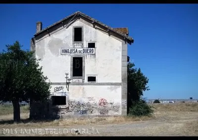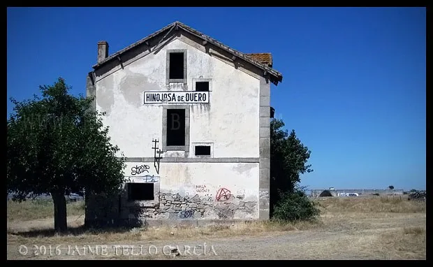 Hinojosa de Duero es un bello pueblo del Abadengo salmantino, tierra de Arribes cuya posesión antaño osciló entre Ciudad Rodrigo y Salamanca. Plaza fuerte de los dominios señoriales, marquesado y señorío, la historia de Hinojosa es la de esta tierra fronteriza entre reinos y obispados. De nada me sonaba a mí Hinojosa cuando la visité por primera vez, caminando perdido por tierras arribeñas. Venía yo de La Fregeneda en un día duro de verano casi tropical con temperaturas sofocantes y un sol que caía con entusiasmo. Poco antes de llegar al pueblo paré a un lado de la carretera y descubrí en mi mapa que Hinojosa contaba con estación del ferrocarril abandonada, de la línea que unía tierras portuguesas con La Fuente de San Esteban y Salamanca. Y allí me dirigí, a documentar la vieja estación alejada del núcleo urbano de Hinojosa. Y quizá por ello, por estar incrustada en un paisaje de dehesas, ve resaltada su inhóspita belleza.