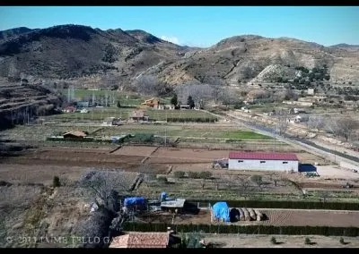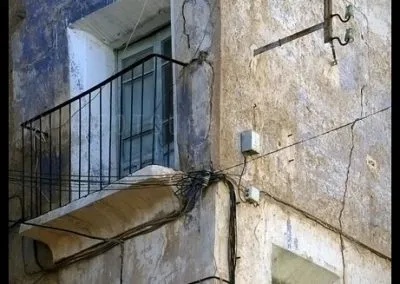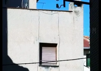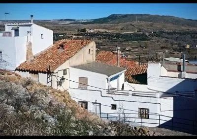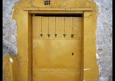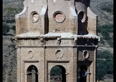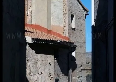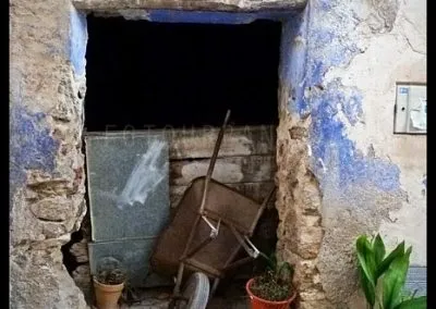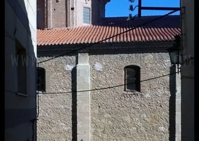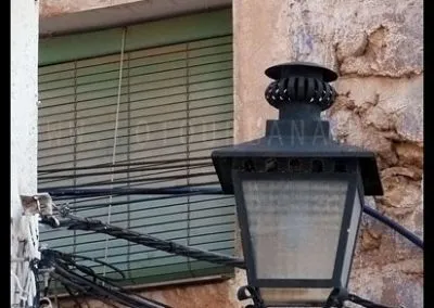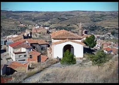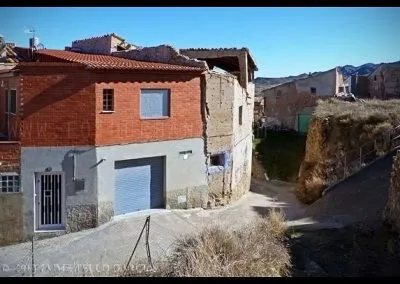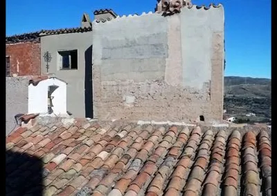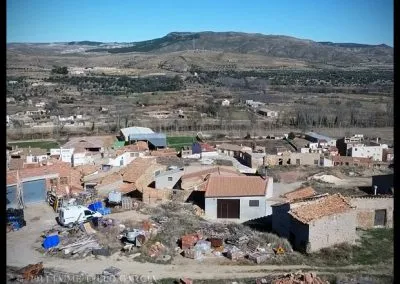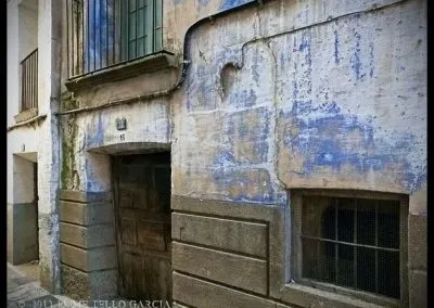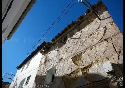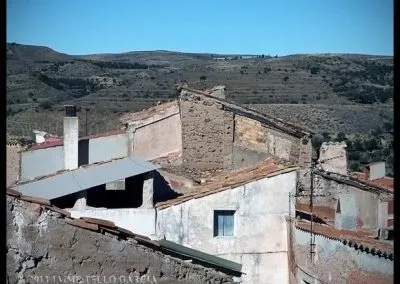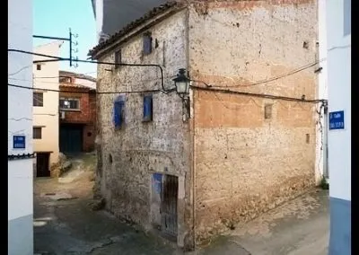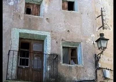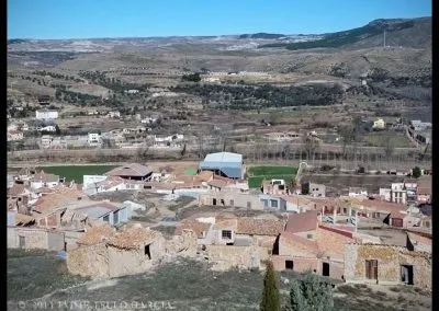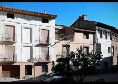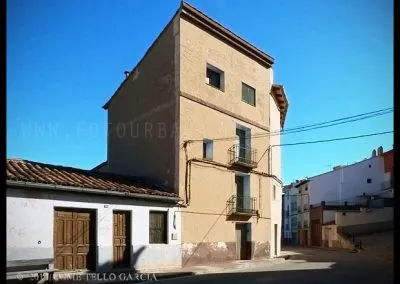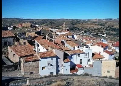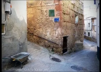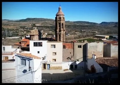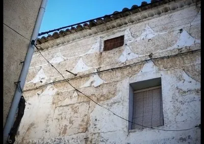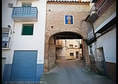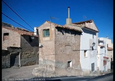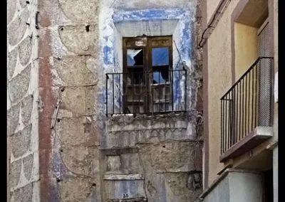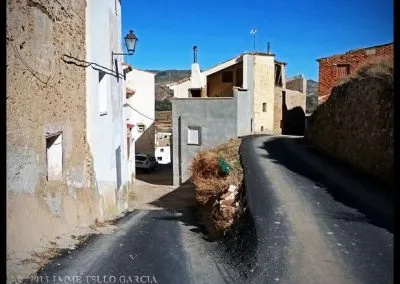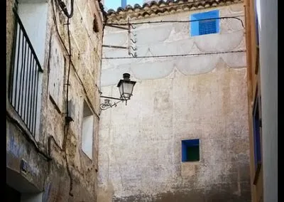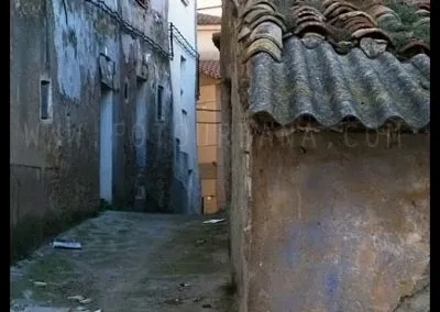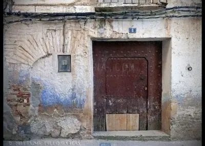 Y ese es el caso de Oliete. El pueblo se ve grande, aunque ha perdido el 75% de los más de 2000 habitantes con que llegó a contar. Su casco urbano cae por una pronunciada ladera sobre el Río Martín, que corre con escaso entusiasmo hasta que alguna tormenta lo desboca. Su callejero es laberíntico y fabuloso, de los más estimulantes que yo haya recorrido, y a él se asoman un gran número de casas abandonadas y arruinadas, que van ganando terreno hacia la parte más elevada del pueblo. Aunque también aparecen casas saneadas, y el ayuntamiento, la iglesia y algunos comercios en su parte más baja, siguiendo la Calle Mayor.