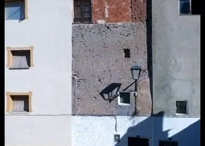 Oliete es un pueblo remoto y poco poblado que debió conocer tiempos mejores. Está enclavado en la comarca turolense de Andorra-Sierra de Arcos, al pie de la Sierra de los Moros e integrado en el Parque Cultural del Río Martín, cuyas aguas bañan la parte más baja del pueblo. Llevaba tiempo deseando recorrer las calles de Oliete, desde que una tarde de hace años, conduciendo entre Andorra y Muniesa, pasé por alli y me cautivó la belleza de la fachada occidental del pueblo iluminada por el sol de la tarde. Casas colgadas sobre un farallón rocoso, morfología urbana que pone de manifiesto el claro el origen morisco y defensivo de la plaza. Y volvi, aunque fue una mañana fría de invierno en la que el sol venía de oriente y no iluminaba el perfil más bello del pueblo, aunque sí otros panoramas no menos interesantes desde el Calvaro. Tras el largo paseo por Oliete, llegué a una conclusión: desde mi punto de vista de extranjero en tierras aragonesas (qué más quisiera yo que llamarme baturro por nacimiento o residencia, tal es mi amor por esta tierra), Oliete representa la quintaesencia del urbanismo y la arquitectura de Aragón. Puede haber pueblos en Aragón más monumentales y hermosos, pero la mayor parte de pueblos son como este, pueblos antiguos, de marcado carácter popular, encaramados a una peña o a una ladera pronunciada en que encontraron refugio y defensa, de calles tortuosas y estrechas con frecuencia heredadas de viejos asentamientos musulmanes y medievales, de casas que crecen a lo alto dada la escasez de suelo en esta orografía dificil. Pueblos de mudéjar y gótico, de ermitas y castillos, de ríos que les dieron vida y suelos áridos y rebeldes. Así se repite el esquema en una buena parte de pueblos aragoneses, en los que se hace evidente la presencia, o la ausencia de estos elementos en fortalezas desmochadas y perdidas, o en amplios barrios y sectores urbanos abandonados a causa de su ubicación remota y complicada en las partes más altas de los pueblos.