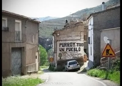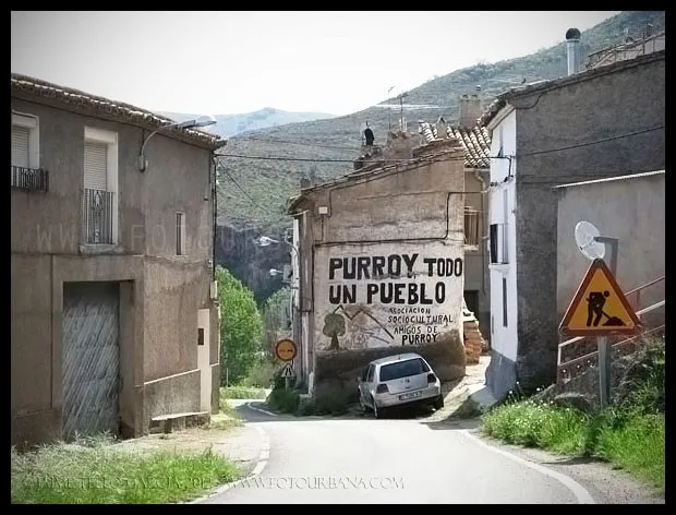 Purroy es un pueblo pequeño que se encuentra encajonado entre el Jalón y dos vías férreas, la vieja línea de Madrid a Zaragoza y la moderna de Alta Velocidad. Se enrisca su casco urbano sobre una marcada muela que gobierna un buen tramo del curso del Jalón y del valle que por aquí forma, que se extiende, antes de entrar en vericuetos, hasta las villas de Morés al oeste, capital municipal de Purroy, y Villanueva de Jalón al este, precioso pueblo abandonado. Es esta una tierra accesible y a la vez escondida, con buenas infraestructuras entre las que se cuenta un apeadero de ferrocarril aún en servicio, y que sin embargo ha sufrido con especial intensidad el drama de la despoblación. De hecho, Purroy cuenta con apenas cuarenta vecinos empadronados, una población envejecida y en retroceso que amenaza con el despoblamiento total en pocos años. Y la factura que ha pagado el pueblo no es menor, ya que abundan las casas abandonadas, cuando no arruinadas. La configuración del casco urbano de Purroy parece remitir a un pasado árabe, momento de dominación musulmana en que se poblaron estas tierras para defender el valle del Jalón, tan cercano a Castilla y tan inequívocamente aragonés. Calles irregulares adaptadas a la orografía, así como sus casas, de factura humilde y presencia antiquísima, de dos o tres alturas, de ladrillo, argamasa y tapial, de colores vivos, grises, blancos y terrosos. Entre los tejados despunta la Iglesia de la Virgen del Remedio, la antigua ermita en lo alto y la ruina del Palacio del Barón de Purroy, del siglo XVII.