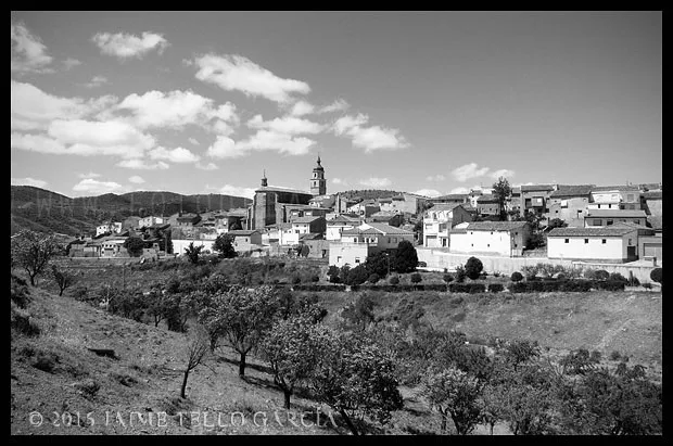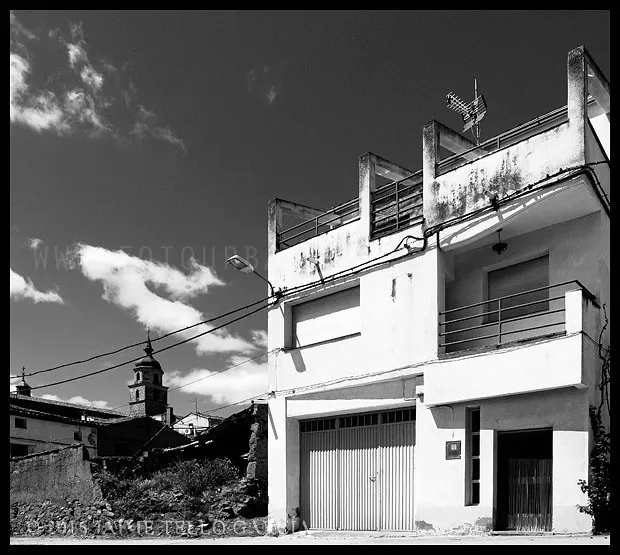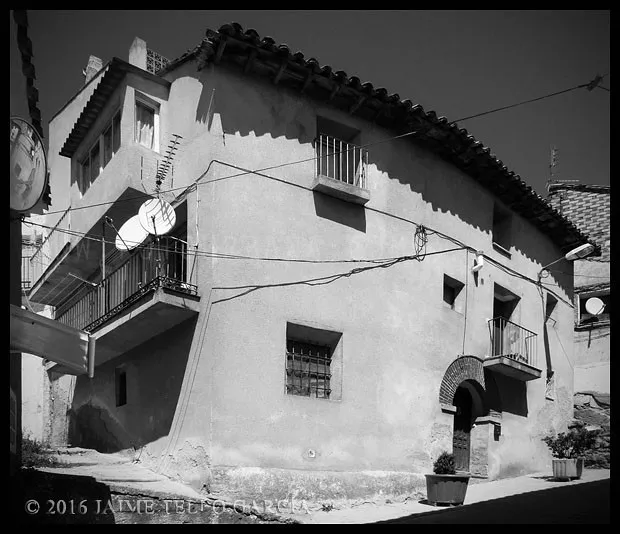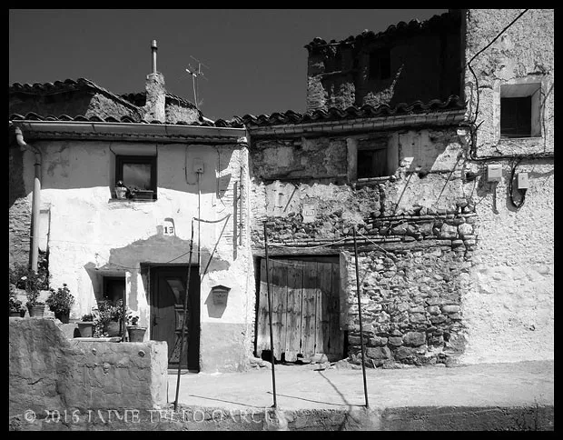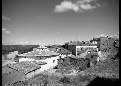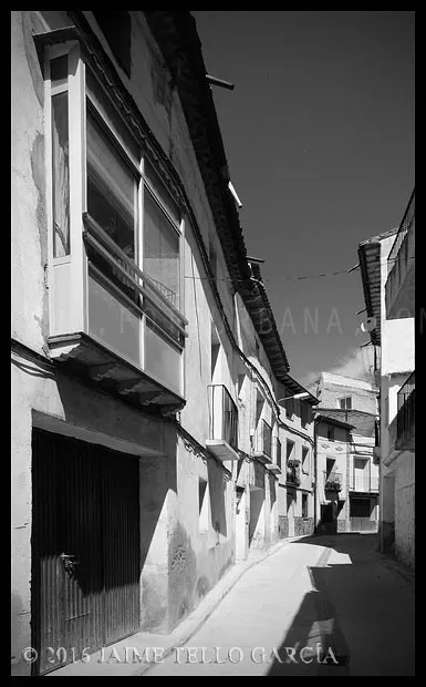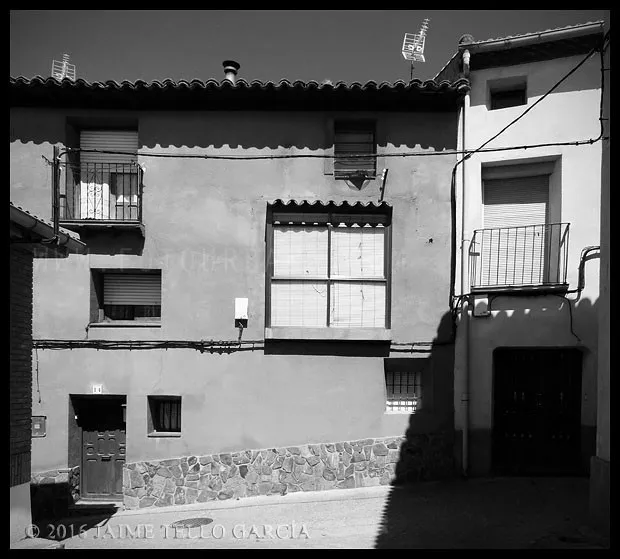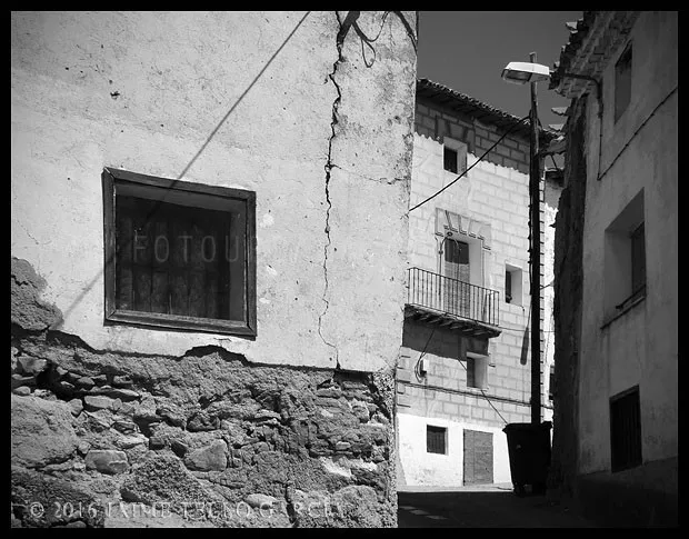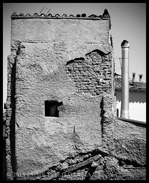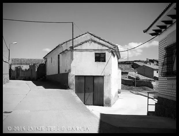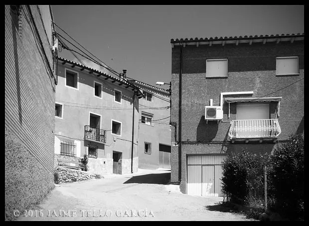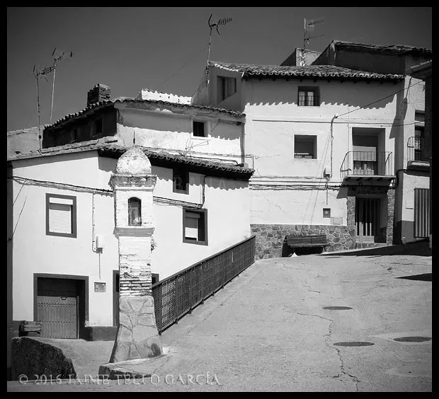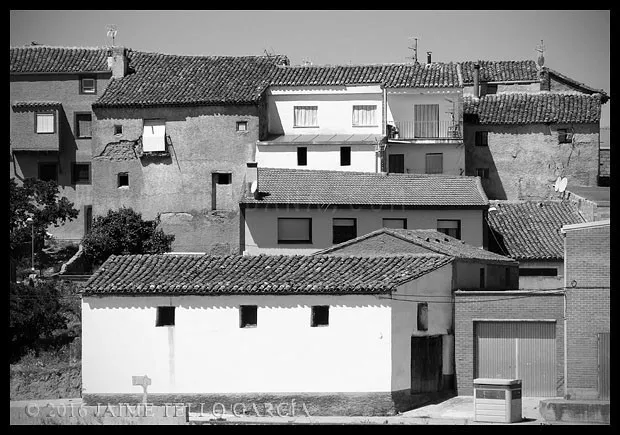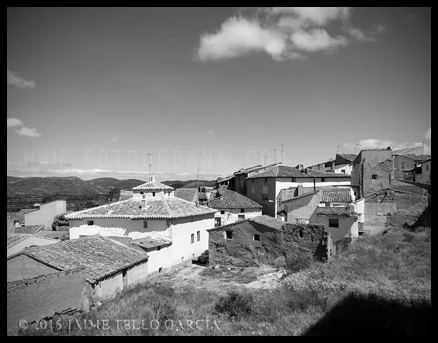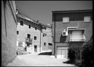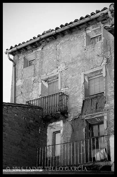 Villaluenga es una excepción en la tierra de Castillos que es el Valle del Manubles. Desconozco si contó con fortaleza o no, lo que parece es que hoy día no queda rastro de ella. Además, al asentarse Villalengua sobre una loma suave, también es singular en la comarca por su morfología: un casco urbano compacto y bien trazado y poco resguardado, cuya forma se asemeja a un círculo, al contrato que Moros, Bijuesca o Torrijo que son fantásticos laberintos urbanos. Por ello el paseo por el pueblo se hace cómodo y agradecido, con suaves pendientes y calles más o menos largas. Lo que sin embargo sí encuentro en Villaluenga al igual que en el resto del valle es el mismo trágico aunque muy pintoresco abandono que es la seña de identidad de muchos pueblos de esta comarca de Calatayud, de esta provincia de Zaragoza y de este Aragón que se sigue despoblando año tras año. Y aún así, es este uno de los pueblos más poblados y con el casco urbano más amplio de todo el Valle del Manubles, con cerca de 400 vecinos. Cuenta con algunos comercios y bares, lo que no es poco por estos lares, si me permiten la rima. En el centro de abre la bella Plaza Mayor a la que asoman los dos edificios más importantes: el ayuntamiento, y tras él, el campanario de la Iglesia de la Asunción, del siglo XVI, cuya elaborada portada se esconde bajo los arcos del edificio consistorial. El resto del pueblo es una sucesión de casas, normalmente de dos alturas y sobrado, algunas renovadas y otras caídas, pero que en general ponen de manifiesto el deseo de los hijos del pueblo por mantener viva su presencia en Villalengua renovando el caserío. Además, el entorno natural es excepcional, con paisajes que se abren y se tornan amables hacia el sur y se vuelven agrestes, casi encañonados hacia el norte por Torrijo.