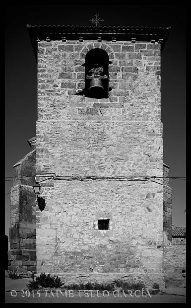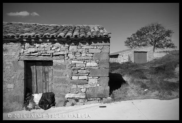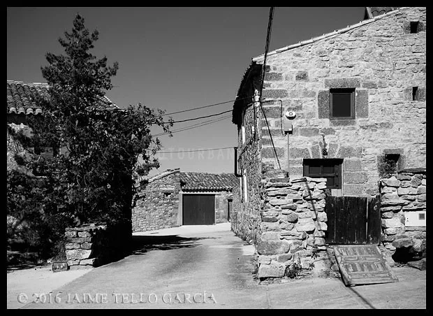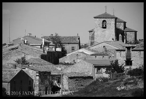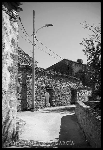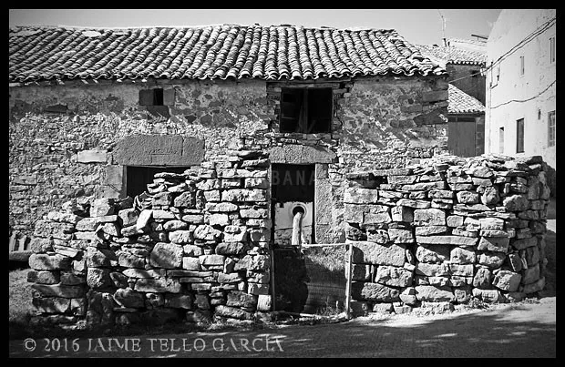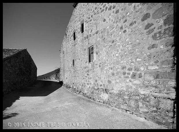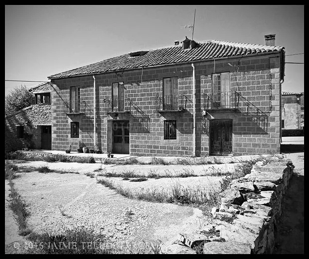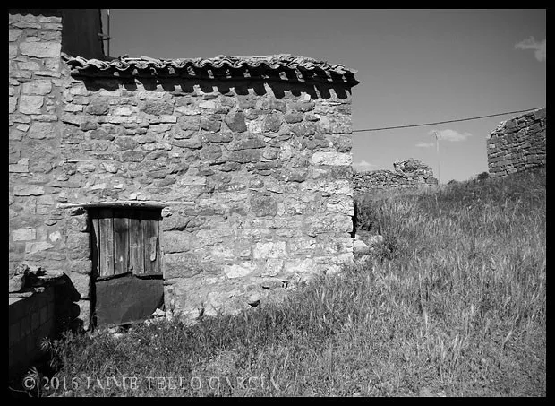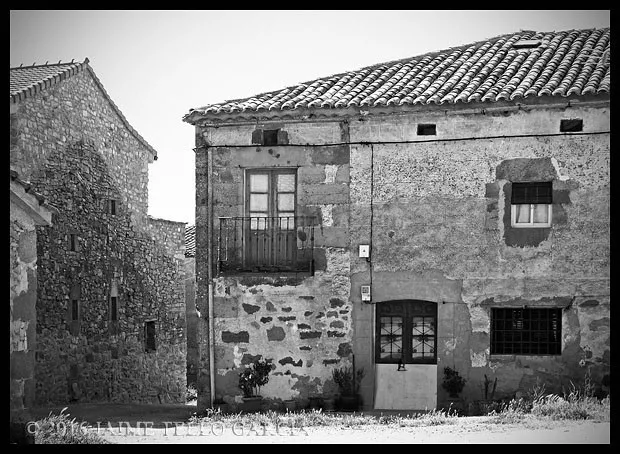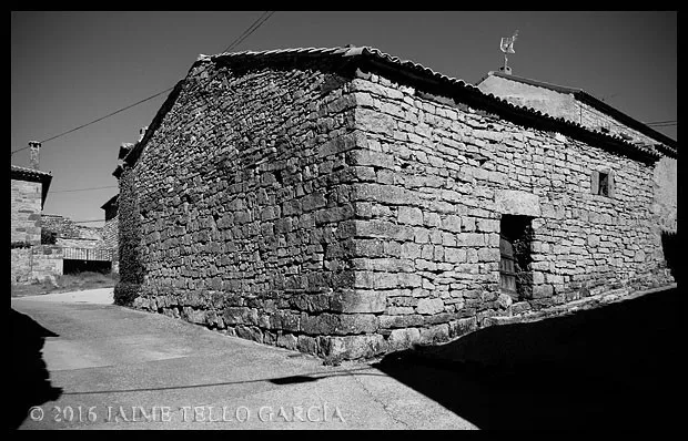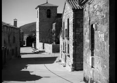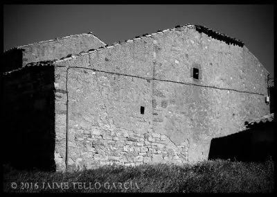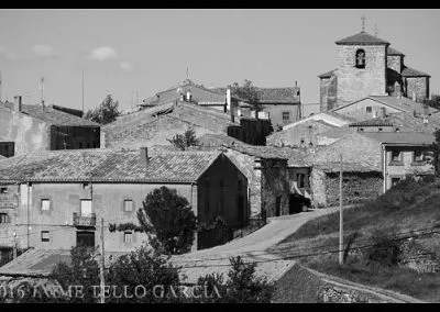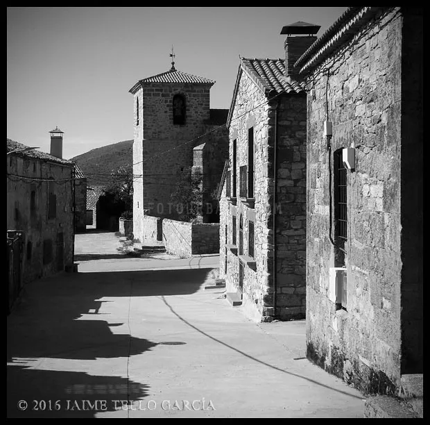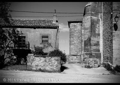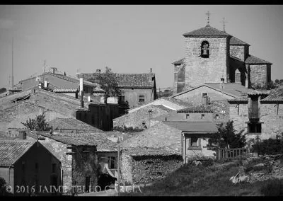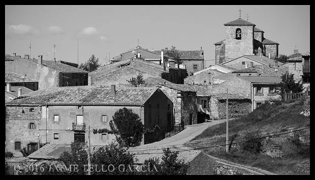 Campos que reventaban en un verdor primaveral que anuncia una cosecha aún algo lejana, interrumpidos por la presencia de pueblos pequeños y preciosos como es Yelo. Paseando por sus calles descubrí un caserío de gran calidad, bien conservado con el mimo que dan el temprano abandono y la posterior vuelta al pueblo de viejos vecinos que marcharon en busca de un futuro y nuevos vecinos que llegan en busca de la paz del mundo rural. Casas enteramente levantadas en una piedra que se tuesta al sol del atardecer. Casas de grandes dimensiones y escasos y pequeños vanos las más antiguas, que buscaban el cobijo del hogar para mantener el calor en un medio de frío cruel. Las casas más renovadas abrían desde sus fachadas amplias ventanas y balcones que, vencido el requerimiento que sus moradores tienen de calentarse gracias a las nuevas tecnologías, buscan la luz un tanto escasa en los inviernos de la estepa castellana. Continúo mi camino y al oeste y el sur del pueblo me topo con sus rincones más más singulares: sus magníficos palomares, la jugosa alameda con la que el río Bordecorex decora sus orillas, la no tan vieja escuela hoy abandonada y una sensacional vista del perfil del pueblo roto por el campanario de su iglesia de origen románico. Vuelvo a las calles y zigzagueo abrazado por las suaves colinas que rodean el pueblo y disfrutando del rumor suave del viento que mece las ramas de los árboles y los brotes inminentes de cereal. Un silencio que ni tan siquiera puede romper el ladrido de algún perro, tal es la soledad y la despoblación de esta bellísima comarca.